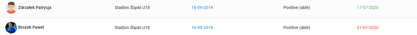 Um zur Untersuchungsliste zu gelangen, wählen Sie im linken Menü Tagebuch Untersuchungen Untersuchungsliste. Sie sehen eine Übersichtstabelle aller durchgeführten Untersuchungen in einem bestimmten Team. Die gültigen Untersuchungen sind grün markiert, während abgelaufene Untersuchungen rot markiert sind.