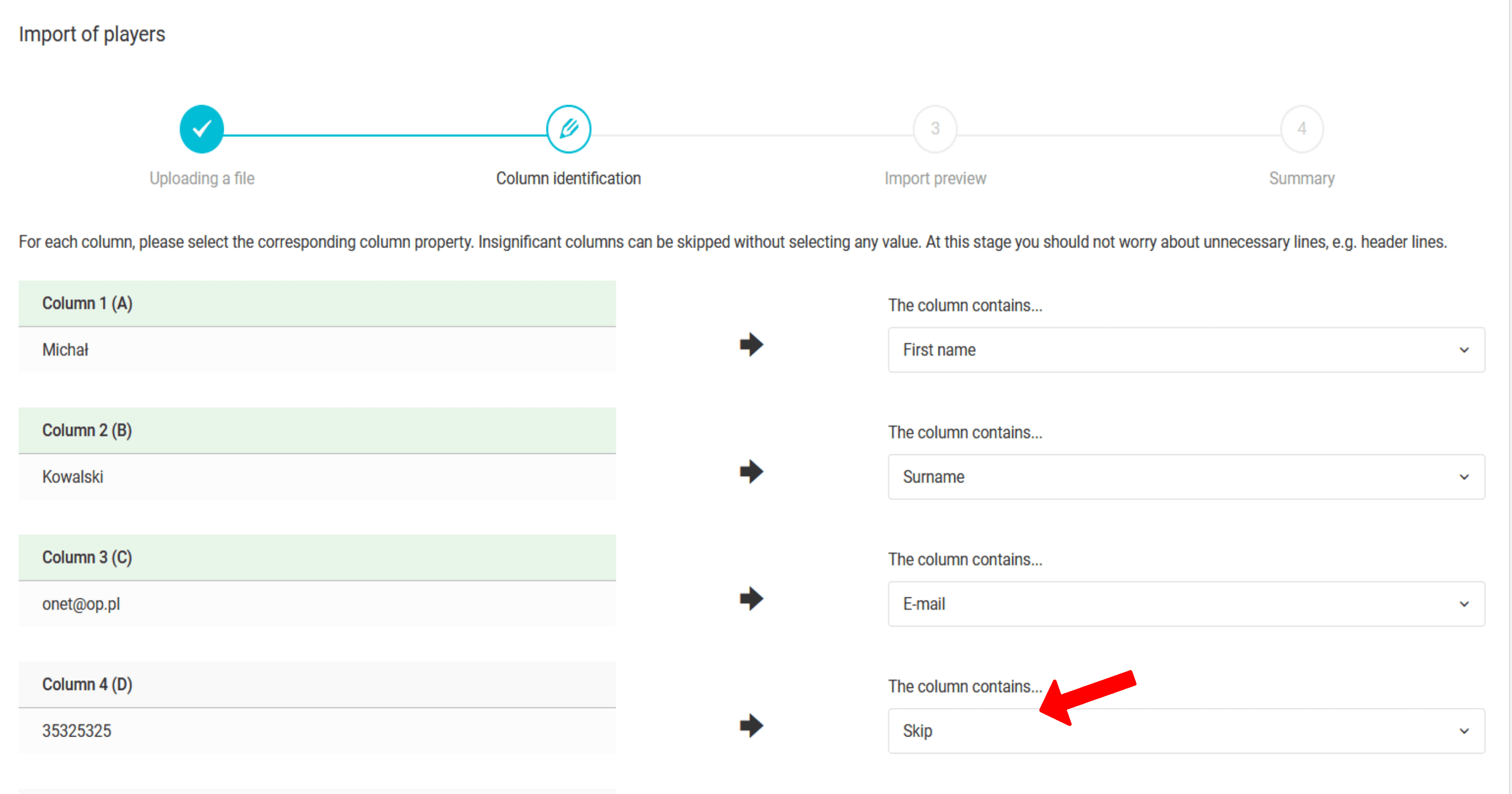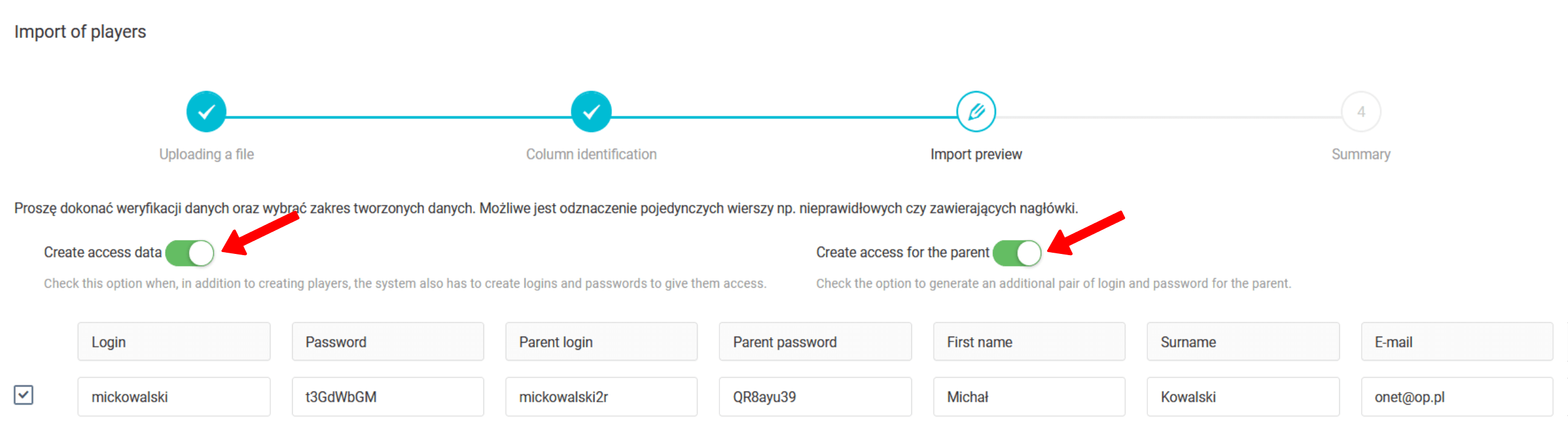 Nach dem Hochladen der Datei in das System müssen Sie den Prozess der Spaltenidentifizierung durchlaufen. Dabei ordnen Sie dem Element in jeder Spalte den entsprechenden Datentyp zu. Auf dem Bild haben Sie bereits die Spalten mit Namen, Nachname und E-Mail-Adresse identifiziert. Die Telefonnummer wird zur Identifizierung verwendet, daher müssen Sie die Option "Telefon" aus der Dropdown-Liste auswählen. Im nächsten Schritt entscheiden Sie, ob Sie für die erstellten Konten ein Login und Passwort generieren möchten und ob Sie Erziehungsberechtigtenkonten erstellen möchten.